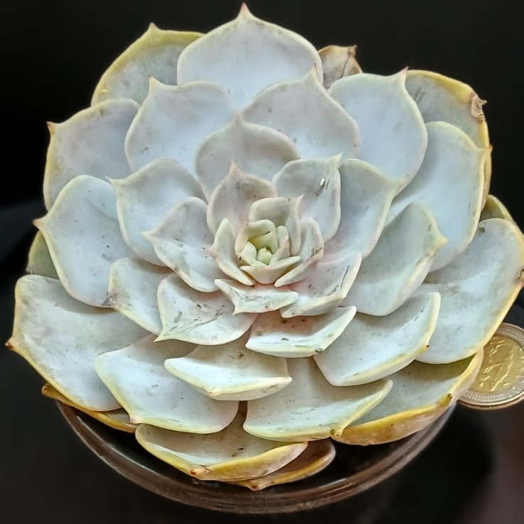 Echeveria lilacina, commonly known as the Ghost Echeveria, is a beautiful succulent featuring pale silvery-gray to lavender leaves arranged in a symmetrical rosette. The spoon-shaped leaves have a powdery coating, giving them a soft, ethereal appearance. This elegant plant thrives in bright, indirect light and well-draining soil, making it a popular choice for both indoor and outdoor succulent gardens. Its delicate coloring and graceful form make it a favorite among succulent enthusiasts.